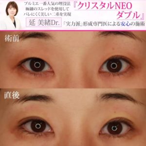 まぶたの裏側に結び目(糸玉)がくることに抵抗がある方は、シークレットと同じく腫れにくく・自然な仕上がりを得られる“クリスタルネオシリーズ”も人気です。